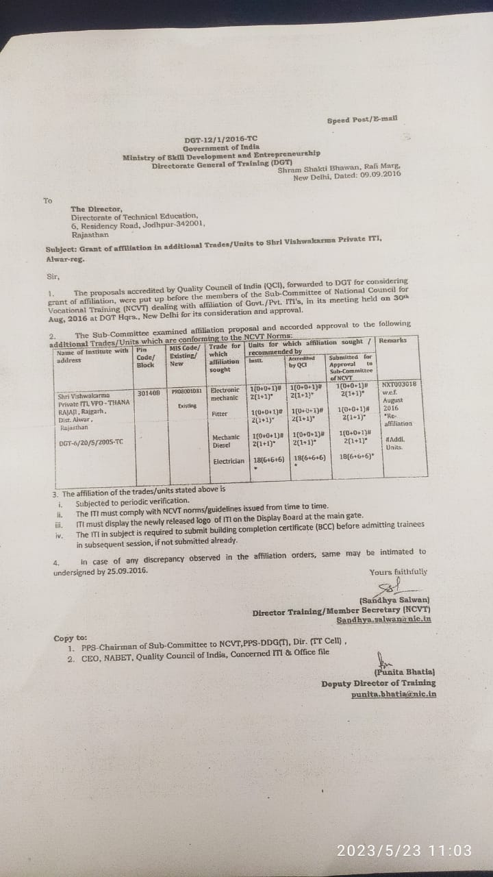 | Name of the Institute | Shri Vishwakarma Pvt. ITI., Rajgarh Alwar |